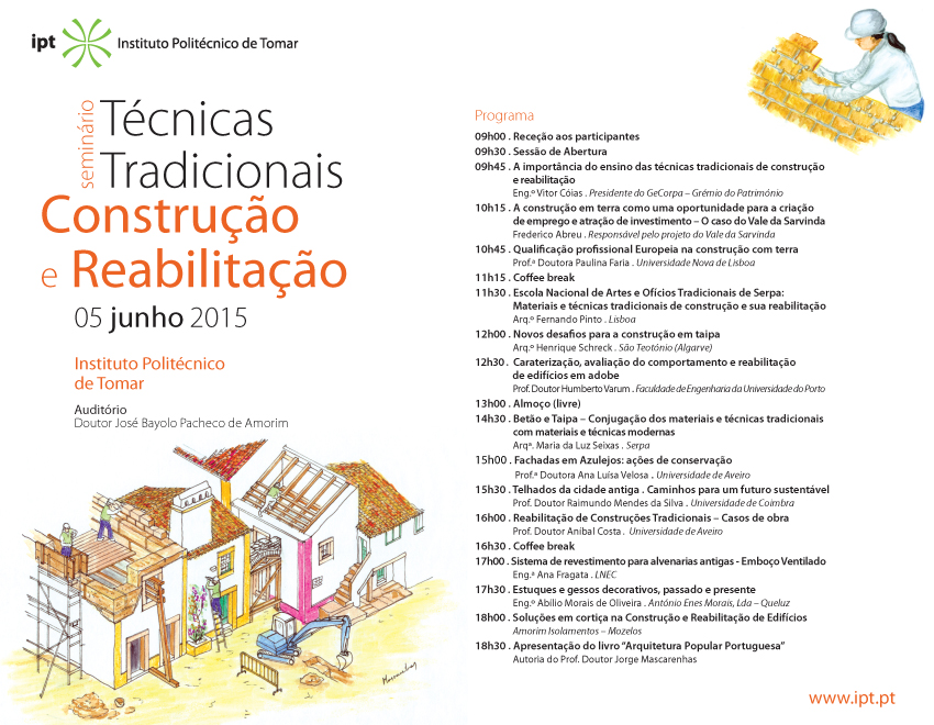 Neste seminário técnico, em que estarão representadas instituições como o LNEC, a FEUP, a Universidade de Aveiro, a Universidade de Coimbra e a Universidade Nova de Lisboa, falar-se-á de construção em terra e em taipa, reabilitação de edifícios em adobe, conservação de fachadas em azulejos, estuques e gessos decorativos, soluções em cortiça e casos de obra.